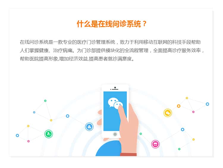 在线问诊系统是一款专业的医疗门诊管理系统,致力于利用移动互联网的科技手段帮助人们掌握健康、治疗病痛。为门诊部提供模块化的全流程管理,全面提高诊疗服务效率,帮助医院提高形象,增加经济效益,提高患者就诊满意度。